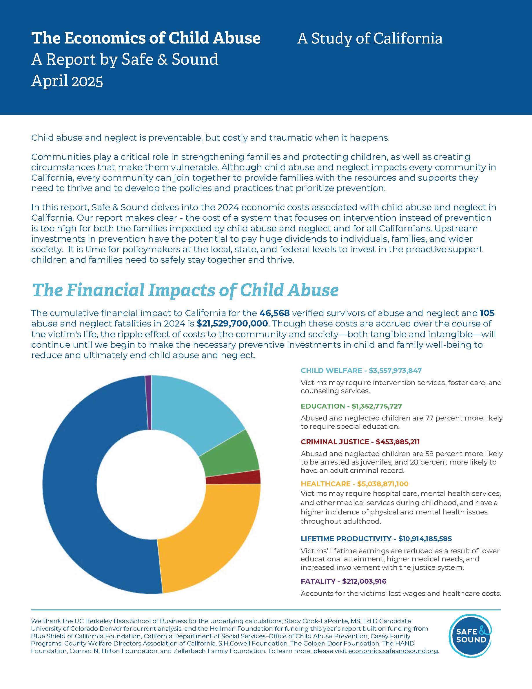 If you are interested to know more about the cost of child abuse and neglect in California, Safe & Sound has published its landmark annual report, showing that child abuse and neglect cost California over $16 billion in 2024. This represents thousands of missed opportunities for prevention. Use the data from this report to see how your county compares to other parts of California to put data behind the need for better prevention services.