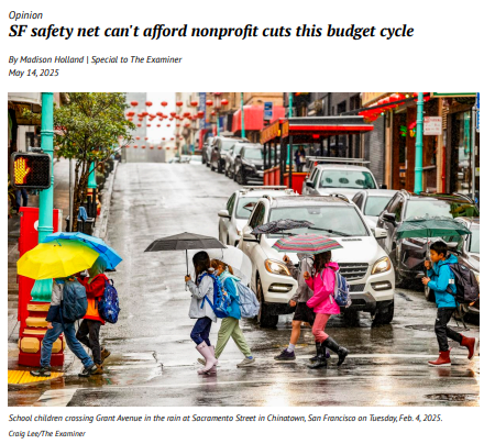 A May 14th op-ed in the San Francisco Examiner highlights the work of a citywide task force, of which the Family Services Alliance is a member, drawing attention to the urgent need for city investment in family-serving nonprofits. When families are supported, they thrive and make San Francisco a safer and stronger community for all! Learn More.
