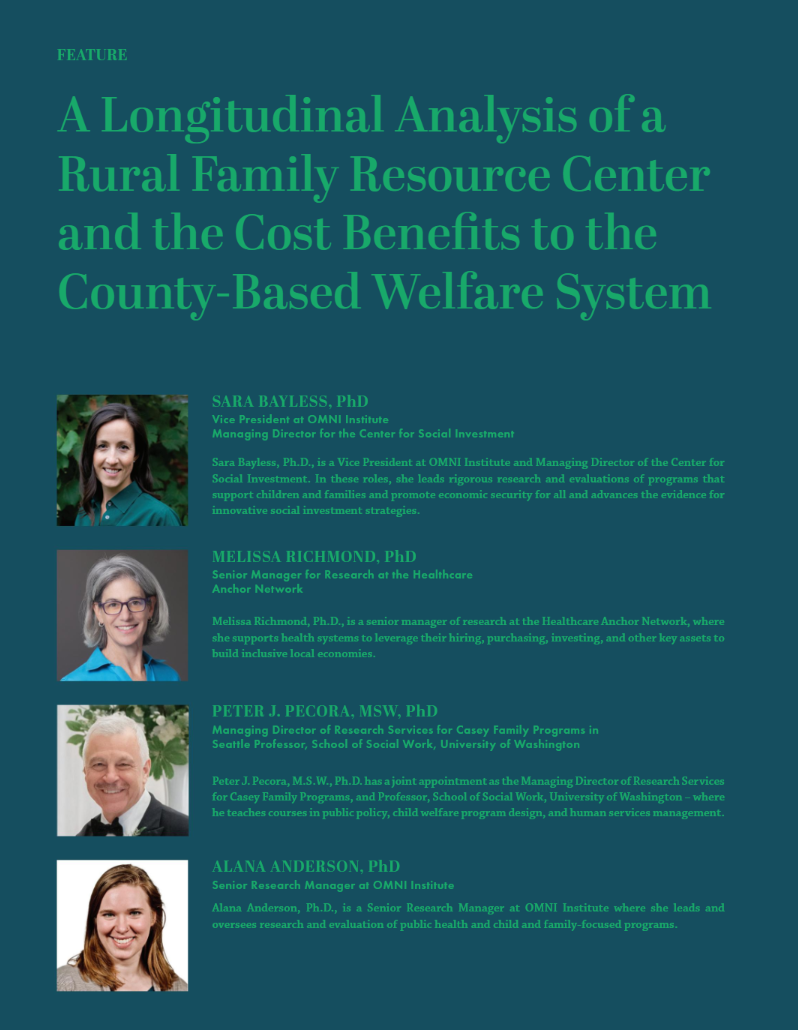 The latest edition of the Family Justice Journal features two important articles. The first is a significant study on the impact of Family Resource Centers, "Returns on Investment of a Family Resource Center to the Child Welfare System" (Page 10). It was conducted by OMNI Institute and Casey Family Programs and provides data on how FRCs strengthen families, reduce child welfare system involvement, and generate economic benefits for communities. The Journal also features an article by Janay Eustace, President & CEO Child Abuse Prevention Center and Katie Albright, Past CEO and President of Safe & Sound, “Building Pathways for Supporting Children & Families in Their Own Communities, A How-To Guide” (Page 32). Learn More.